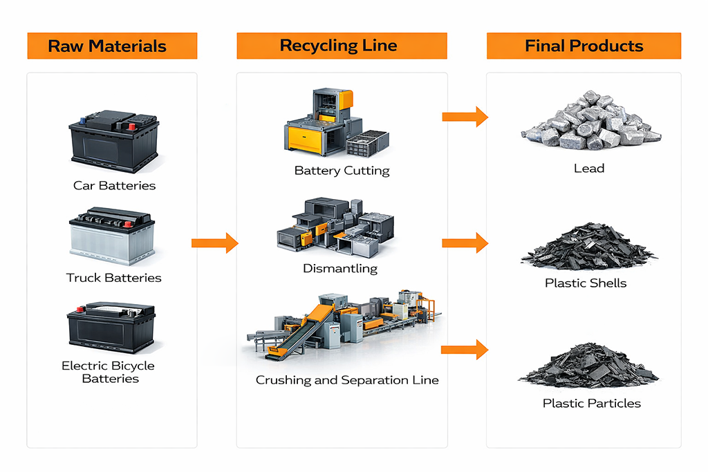 The final recovered products include purified lead and plastic battery casings.